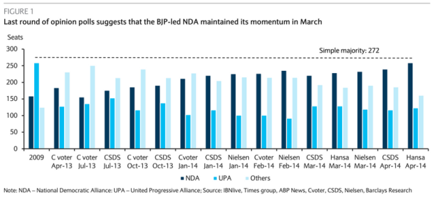 Narendra Modi looks likely to become India’s next Prime Minister – polling in recent months has indicated that his party and its umbrella coalition (the NDA) are set to win the current election.