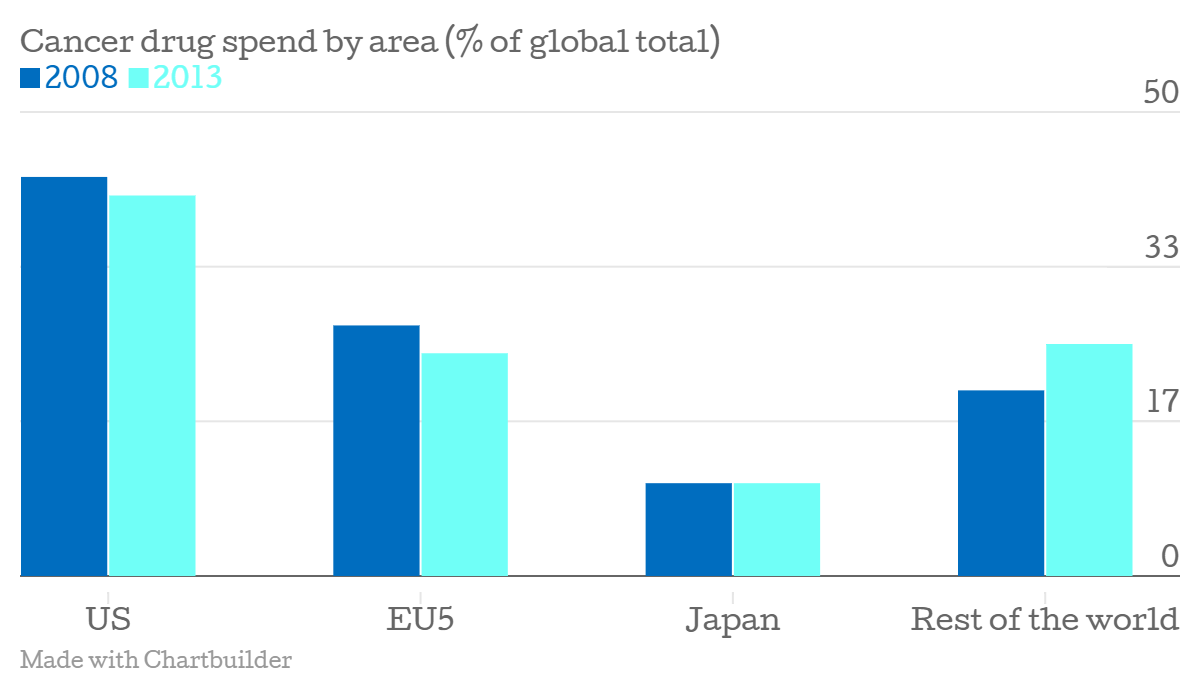 The IMS Institute for Healthcare Informatics estimates that last year, global spend on cancer drugs reached $100bn (£66m) for the first time ever, which amounts to $99 per head. This was up from $71 per head in 2010, and marks a 10.3 per cent increase in spend compared to 2013.