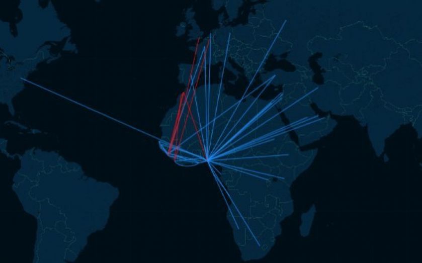 The interactive map below shows the infected areas and the 41 countries which are one flight away, according to Skyscanner (see disclaimer below map). Quartz made a similar visualisation last week and found 35.