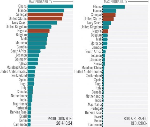 Due to its flight connections with affected countries such as Guinea, Sierra Leone and Liberia, France also stands a high risk of the virus entering the country, 75 per cent, reducing to 25 per cent with similar flight reductions.