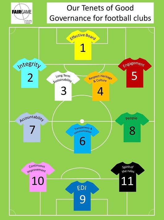 Fair Game, a leading advocate for regulation, has just published a suggested Code of Governance for Football Clubs in England with 11 tenets (none on the subs bench) as shown in its schematic below.