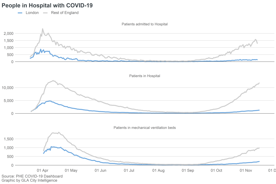 Even when looking at hospital admissions, the capital – home to 8-9 million people, one-sixth of the total population and by some distance the area with the most social mixing, densest housing and essentially the perfect petri dish for transmission – barely turns the dial.