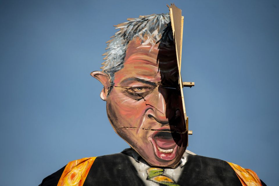 Members of the society repaired the effigy after it fell apart during the unveiling. Images: Getty