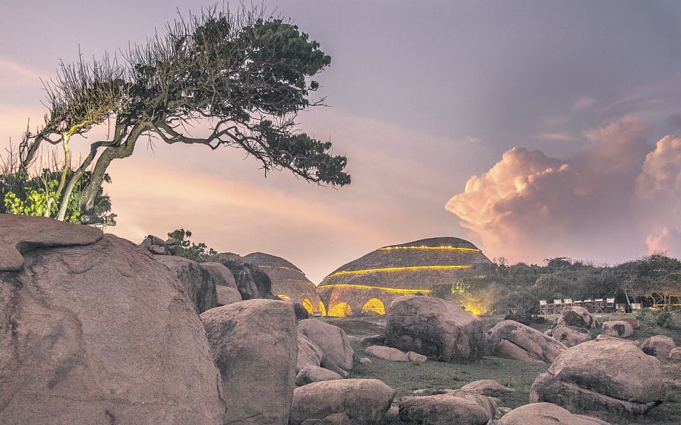 In a concept design by Nomadic Resorts, the extraordinary bamboo-and-wood atriums of the bar and restaurant take their domed forms from the two-billion-year-old rocks on the shore. The huge infinity pool blends seamlessly with the horizon beyond, where the pounding surf of the Indian Ocean meets the vast blue of the sky. At sunrise you might see fresh elephant tracks in the sand.