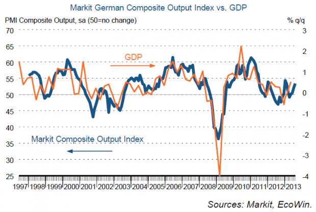The survey provides confirmation that Germany’s economy is back on a solid footing and likely to remain in expansion through the third quarter of 2013. Manufacturing was an especially bright spot in August, with the latest figures suggesting that a rebound in export orders helped output growth accelerate to its strongest for over two years.