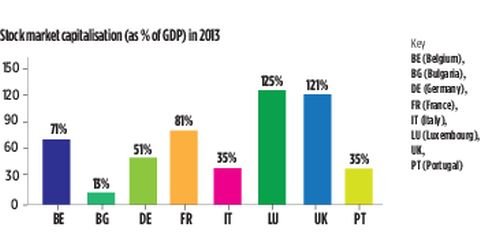 Europe’s venture capital market is only one-fifth the size of the US’ sector. And while US stock markets’ capitalisation amounts to 138 per cent of GDP, those in Europe amount to just 63 per cent – showing it is harder for European firms to access finance.