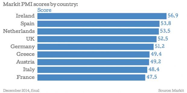 Weighing down the index were Italy and France. Italy is sliding in the wrong direction entirely, with its reading of 48.4, while still above France’s, still representing the lowest rate for 19 months. France was at a four-month low, while Greece and Austria, the other two countries whose indices are shrinking, were at four-month highs.