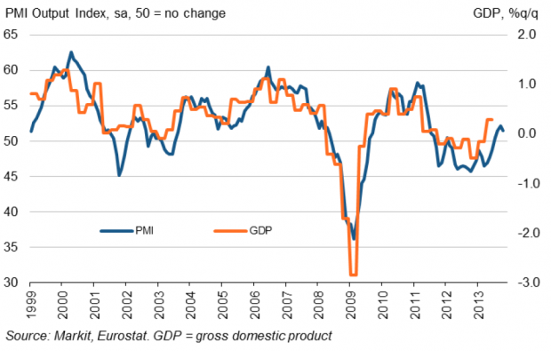 Eurozone growth is slowing, according to the latest purchasing managers' index (PMI) data from Markit. These flash estimates suggest that the area's exit from recession may nonetheless be more than temporary – they signal growth for a fourth consecutive month.