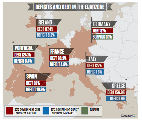 Between 2009 and 2012, government debt as a percentage of the currency union’s GDP has swelled from 80 to 90.6 per cent, while government deficits have dropped from 6.4 to 3.7 per cent over the same period.