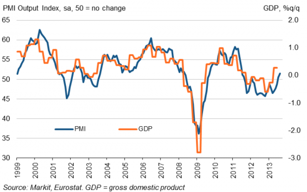 Data from Markit has shown the currency bloc's purchasing managers' index has risen from 50.5 to 51.5.