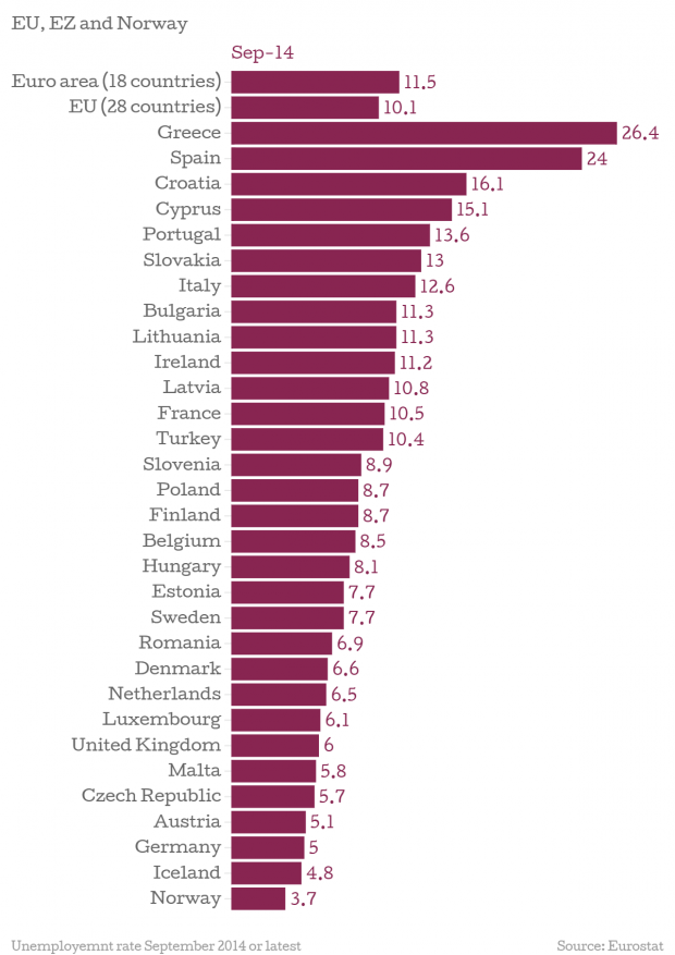 The country with the highest unemployment was Greece, with 26.4 per cent, followed by Spain with 24 per cent. Germany, despite apparent weakening in its economy, has a rate of just five percent.