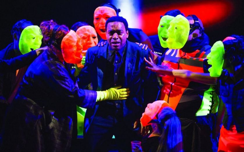 Central character Everyman, played by Oscar winner Chiwetel Ejiofor, is the embodiment of man’s selfishness. He’s a self-proclaimed “Master of the Universe”; young, rich, promiscuous, bubbling over with ego and joie de vivre. We first meet him as he hurtles to his death from atop a skyscraper, after which the clock rewinds to his last night on earth, his 40th birthday party. This magnificent scene, which sets the tone for the rest of the play, is reminiscent of the epic party from The Great Beauty – Everyman and his sybaritic friends, their neon clothing glowing under UV lights, snort 20ft lines of cocaine, dance on tables, swing each other across the stage, all to a pulsing electronic soundtrack.