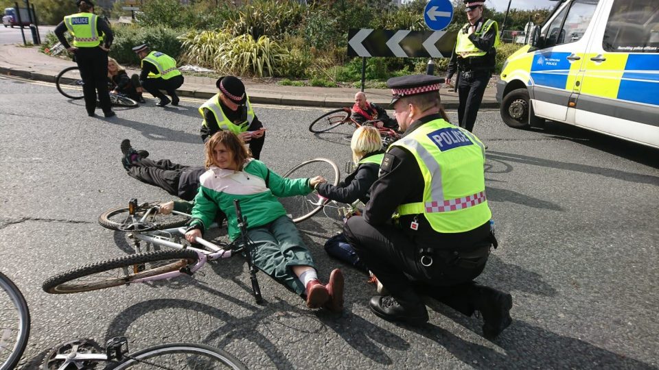 Extinction Rebellion cyclists arrested at the private jet terminal of London City Airport (Jamie Lowe)