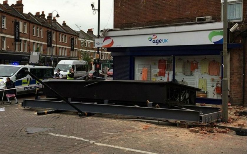 A huge outdoor billboard hanging above a shop on the corner of Mellison Road and Mitcham Road in Tooting collapsed at 7.30am this morning.