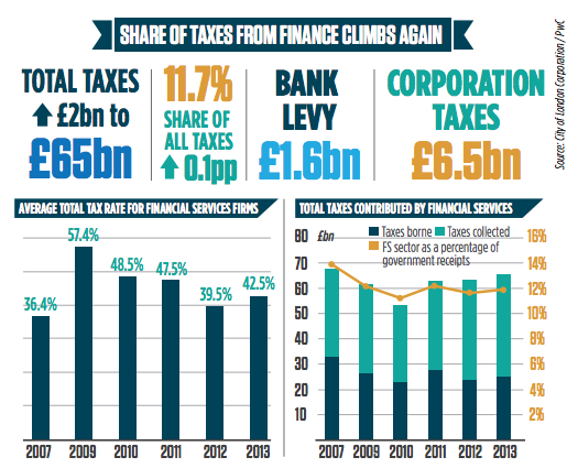 THE UK’S financial services contributed £65bn in taxes during 2012-13, rising £2bn from last year to make up more than one tenth of all revenues.