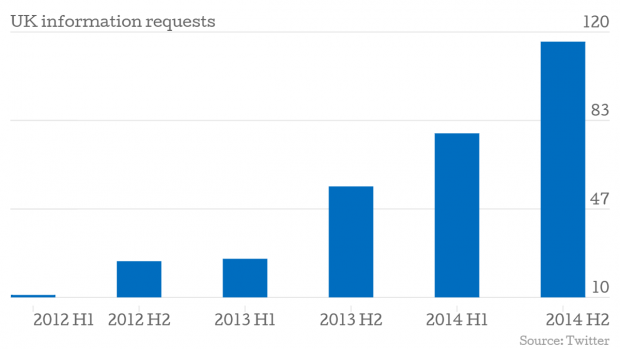 The UK government has become more paranoid about social media: the number of information requests has increased from 11 at the start of 2012 to 116 at the end of 2014. Removal requests from the government has also leaped, from one at the beginning of 2012 to 18 at the end of 2014.