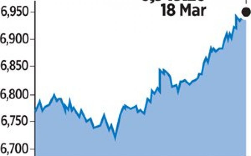 The FTSE 100 closed up 107.59 points, or 1.6 per cent, at 6,945.20, shy of its all-time high at 6,974 points hit earlier this month.