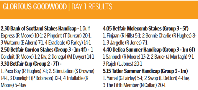 Paco Boy stole the thunder of top jockey Ryan Moore as he swept to victory in the big race of the opening day of Glorious Goodwood, the Betfair Cup.