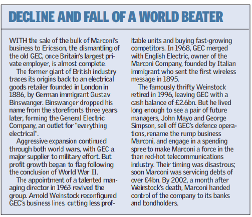 Marconi essentially put itself up for sale in April, after failing to win a portion of BT’s £10bn network upgrade contract. BT, the country’s biggest fixed-line operator, had been Marconi’s biggest customer. Marconi shares halved in value following the disappointing news; the former GEC had only just regained its footing after a disastrous spending spree on over-priced dot.com era assets nearly led it to bankruptcy.