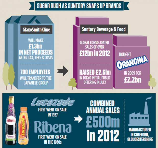 JAPANESE firm Suntory Beverage & Food yesterday agreed to buy GlaxoSmithKline’s (GSK) Ribena and Lucozade brands for £1.35bn, in one of the largest deals in the sector so far this year.