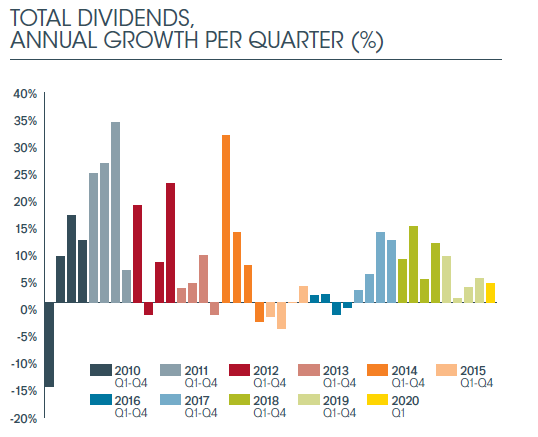 Surprisingly, there was almost no impact from the pandemic on first quarter dividends. Payouts rose 3.6 per cent to a first quarter record of $275.4bn. The US and Canada both had all-time quarterly records, while Japan, Hong Kong, and Russia broke first-quarter records.