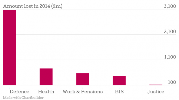The graph below shows the five government departments that lost the most during that time, with the Ministry of Defence far exceeding the rest.