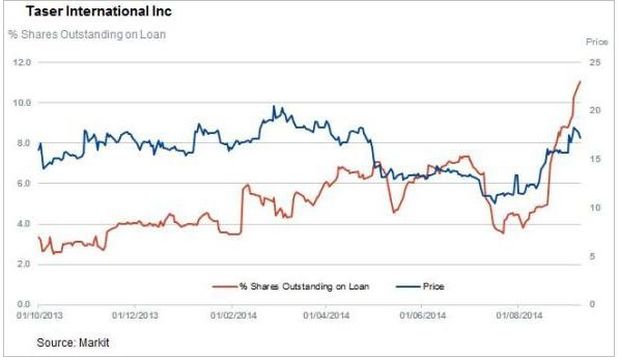 Taser International, the company that produces the eponymous electroshock devices, has also seen shorts pile in after a rally in shares following the weeks of ongoing unrest in Ferguson, Missouri.