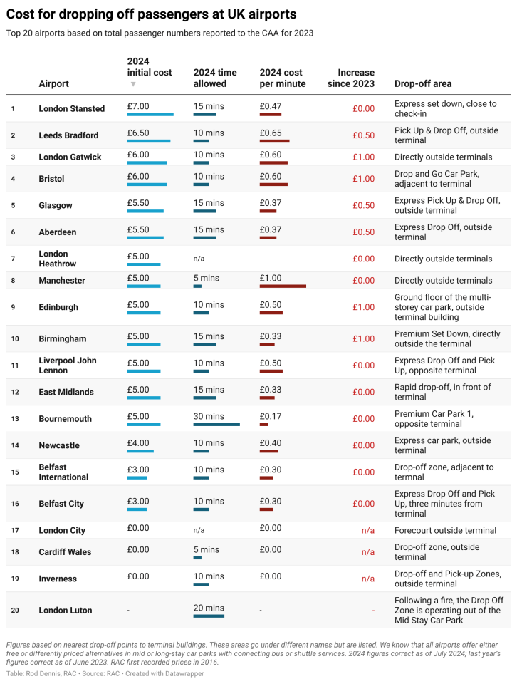 London Gatwick (£6 for 10 minutes), Edinburgh (£5 for 10 minutes), Birmingham (£5 for 15 minutes) and Bristol (£6 for 10 minutes) have all increased charges by £1 when compared with 2023.