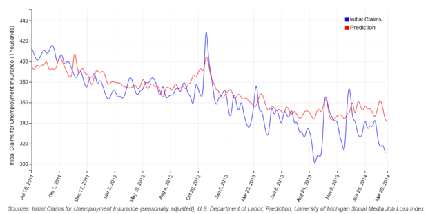 Here's how the University of Michigan Social Media Job Loss Index predictions fare against the official initial claims for unemployment insurance numbers (they update with the latest data here):