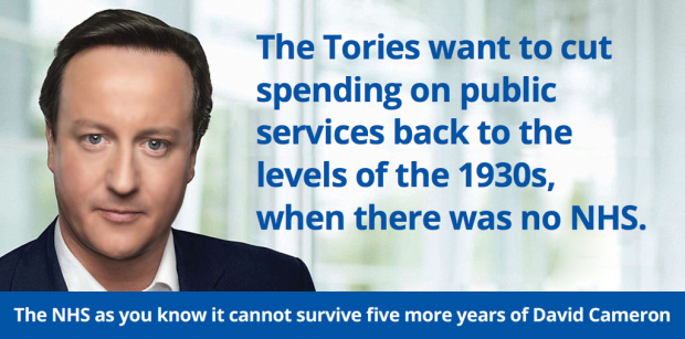 The poster featured an air-brushed picture of David Cameron from older Conservative poster with the caption "The NHS as you know it cannot survive five more years of David Cameron".