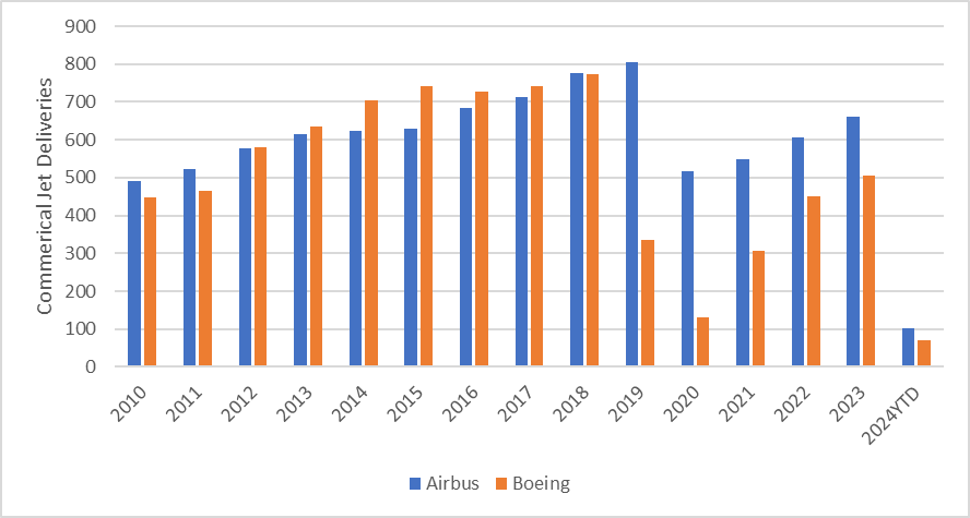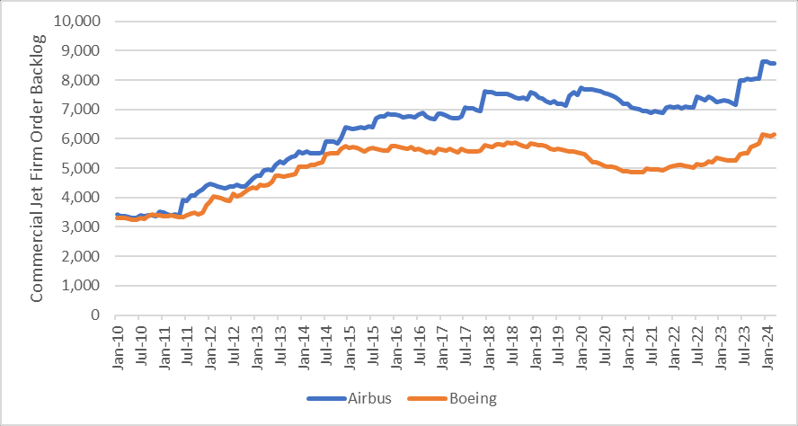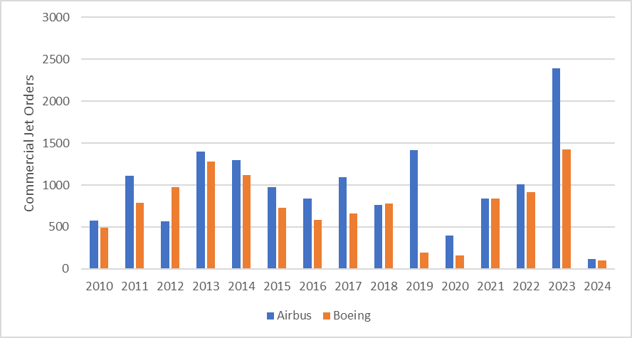 And Boeing has also fallen further behind its long running rival on commercial jet orders over the last decade. The gaps in 2019 and 2023, the two years following the fatal crashes that weren’t affected by Covid-19, were particularly steep.