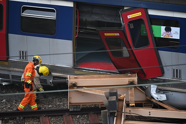 Local media images show MTR staff standing at the site of a derailed train, which remained upright but had been split across tracks.