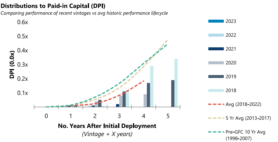Using a comparison of private equity ‘vintages’, or the year when capital was first deployed in the fund, Jefferies analysts discovered that “distributions from recent vintages are significantly lagging historical averages”.