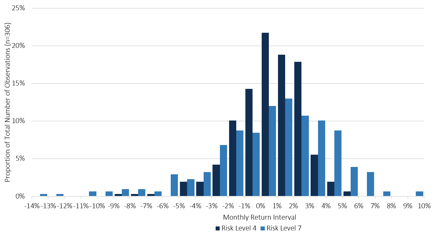 Perhaps a better indicator of usual volatility can be seen in the chart below, which illustrates the distribution of actual and historic simulated monthly returns for Netwealth Risk Level 4 (which provides a balanced exposure across equities and bonds) and Netwealth Risk Level 7 (which provides predominantly equity exposure) since 1992. It shows that the Risk Level 7 returns have greater variability than those of Risk Level 4, which are more clustered around small, positive levels.