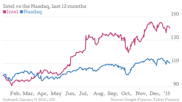 It was a strong end to 2014 for Intel. The world’s largest maker of semiconductors reported revenue of $55.9bn (£36.8bn) for the full year, a bump of six per cent on last year’s figure. That jump was matched by the fourth quarter figure: also up six per cent, this time to $14.7bn.