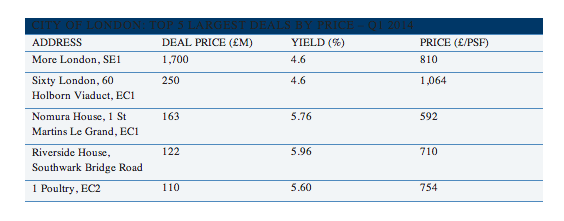 The top five deals in the City & Docklands accounted for £2.35bn, or 71 per cent of total investment in the first quarter.