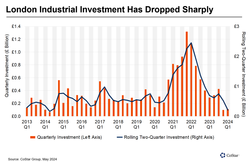 Just over £100m was spent on greater London industrial investment last quarter, down 62 per cent on the same quarter a year ago, figures by CoStar shared exclusively with City A.M reveal.