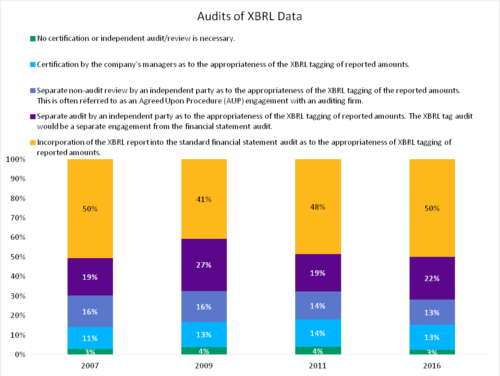 Accordingly, per a 2016 survey of CFA Institute members, 77 per cent of respondents who are aware of XBRL want some level of assurance over the XBRL report—with 50 per cent agreeing that the XBRL report should be incorporated into standard financial statement audits.