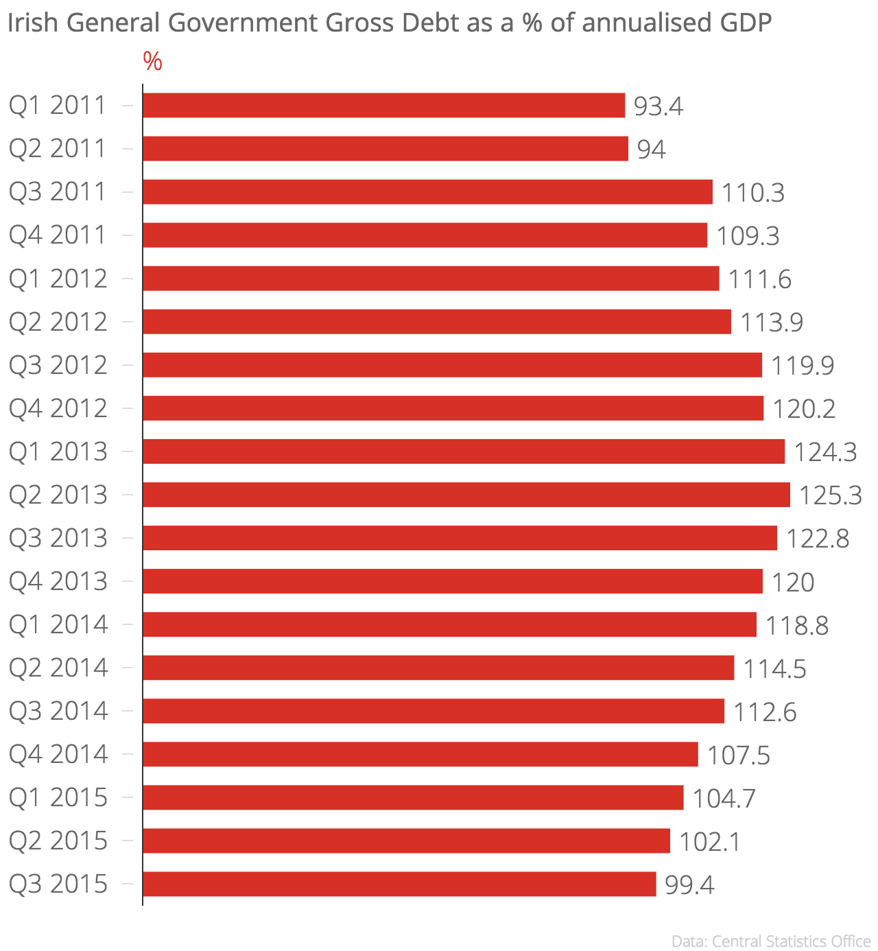 According to figures released today by the Central Statistics Office, general government gross debt in the country for the third quarter of 2015 was €204.2bn (£157.2bn), which is 99.4 per cent of annualised GDP.
