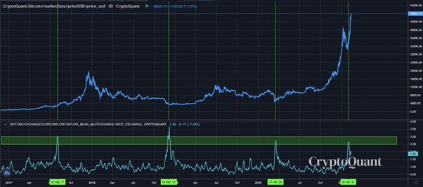 Both of these metrics have been largely responsible for the recent sell-off in Bitcoin. They also contributed to the selling in January when Bitcoin had a steep correction, though I cite other reasons, as shown in the annotated chart below.