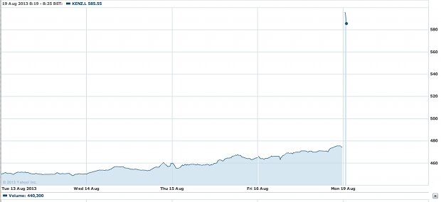 Shares in Kentz ended up two per cent at 475.9p on Friday on rumours of the bid. They're now trading even higher than AMEC's offer at 590p.