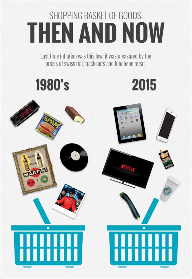 When it comes to changing culinary tastes, the basket of goods shows luncheon meat, choc ices and Swiss rolls were du jour, compared to 2014 when courgettes, garlic bread and drinking yoghurts made the grade.
