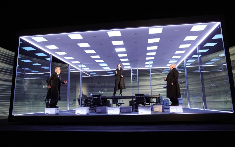 The action all takes place in a rotating glass cube, an archetypal modern office, a ghost of the future calamity that would befall the company – and the world – haunting even the Lehmans’ earliest dealings. Throughout the three acts, characters scrawl on the glass with marker pen, creating a visual legacy of this most adaptable of family businesses.