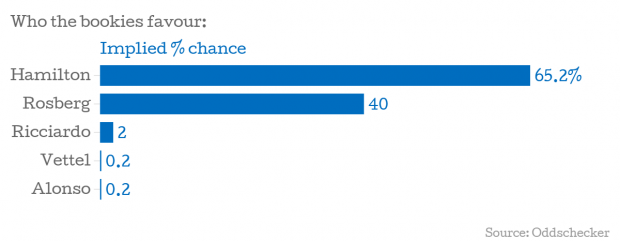 The bookies however don't see things as being that close. With a little bit of maths it is possible to work out implied percentage probabilities from bookies' odds and they are revealing. It is worth noting however that the sample size for each is not the same, and so the figures should be taken with a pinch of salt. Not all bookies offered odds on all five drivers.