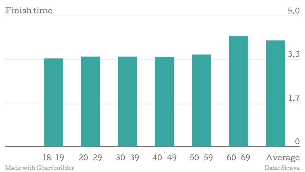 The average finish time for Strava runners was a respectable 4:06:08. The fastest group was those aged 40-49, who completed the course in 3:43:14.