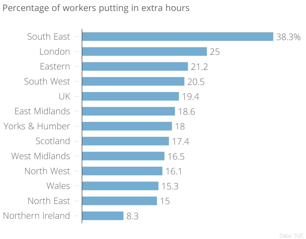 But it's those in the South East, rather than workers in the capital, who are most likely to do overtime. Some 38 per cent of people living in the South East put in unpaid hours last year, followed by 25 per cent of Londoners, and 21 per cent of those living in the East.