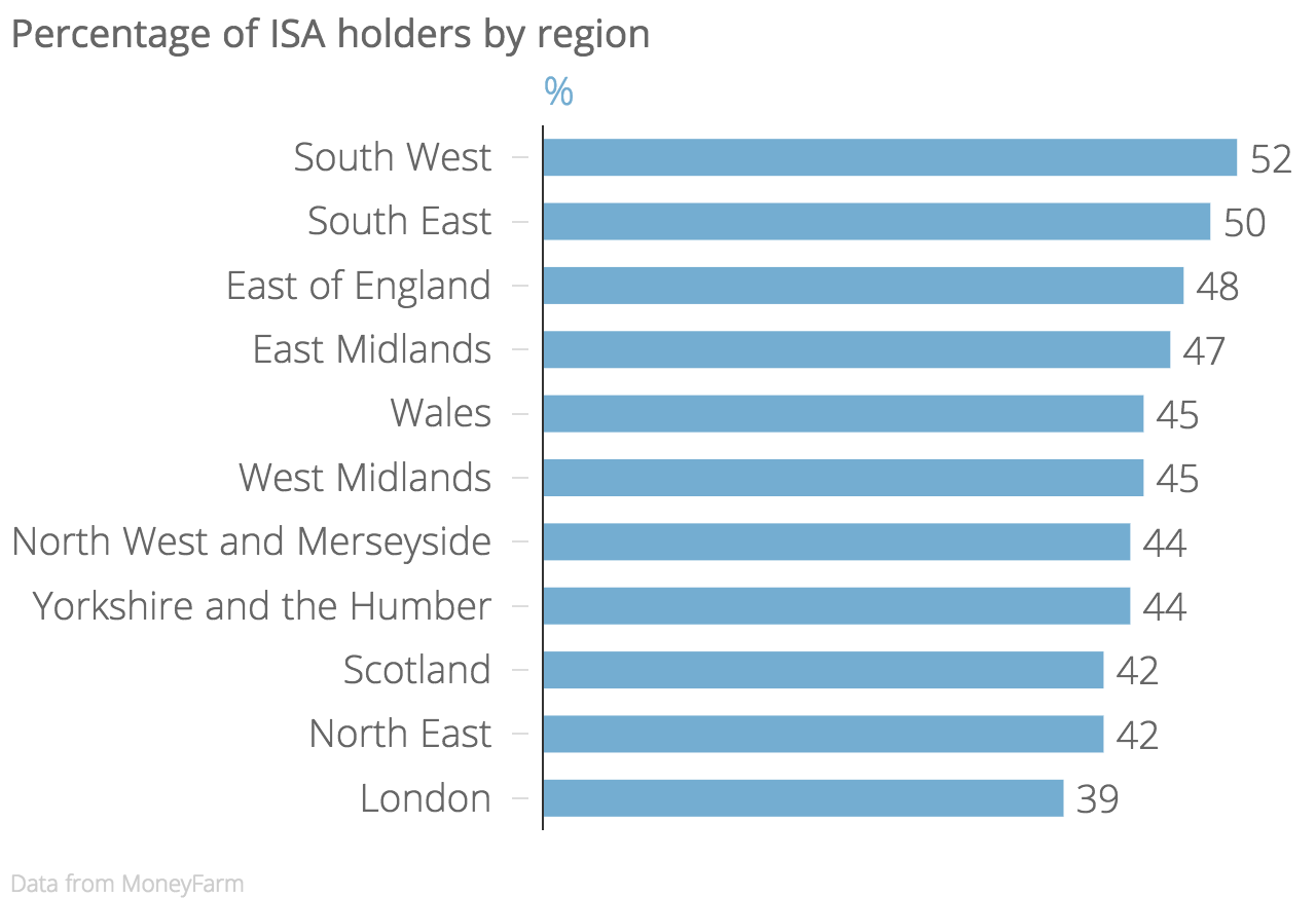 By comparison, 44 per cent of adults across Great Britain have savings stashed in an ISA, while the product is proving particularly popular in the south west, where more than half (52 per cent) own an ISA.