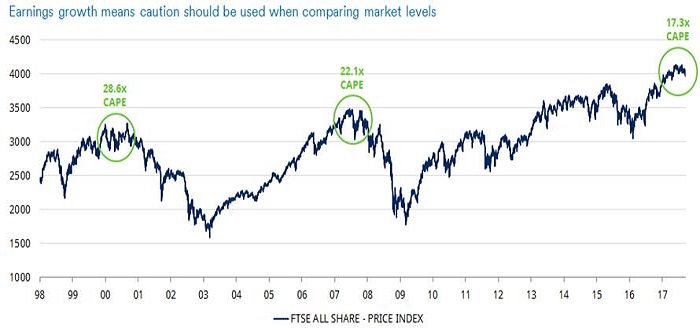 In aggregate, the UK market is not as expensive as the US market, but it is no longer cheap. The chart below shows the FTSE All-Share price index from 1998 to today, annotated with the CAPE at market peaks in green.
