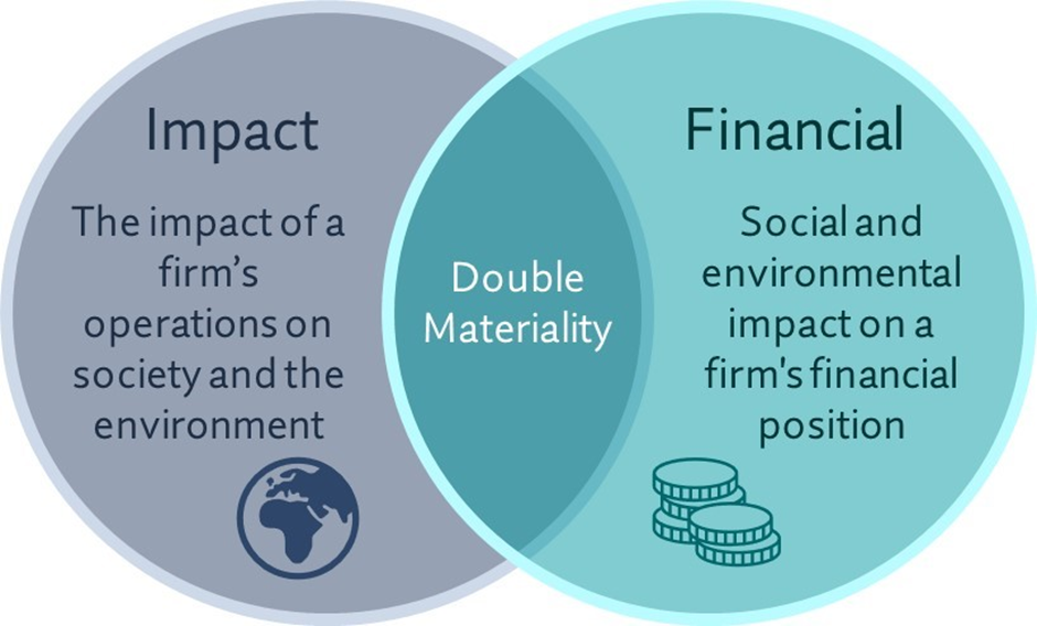- Double Materiality. Non-financial impact of a firm on the environment and society are considered in addition to financial materiality. For example, the depletion of the world’s natural capital that typically is not priced into products, or the removal of zero-hours contracts which may not be the best thing for a company’s bottom line but is considered materially better for their employees. Double Materiality is more aligned to the definition of Sustainability.