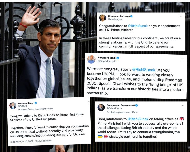 World leaders including President Joe Biden, India’s Narendra Modi and France’s Emanuel Macron have congratulated Rishi Sunak on his rise to be Prime Minister.